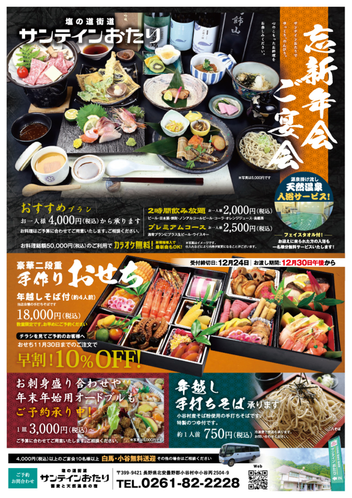小谷村では2025年10月11日〜11月30日まで「おたり新そば祭り」を村内の各地で開催しております。 サンテインおたりは2025年11月1日~11月3日の開催です 毎年恒例で各店舗で